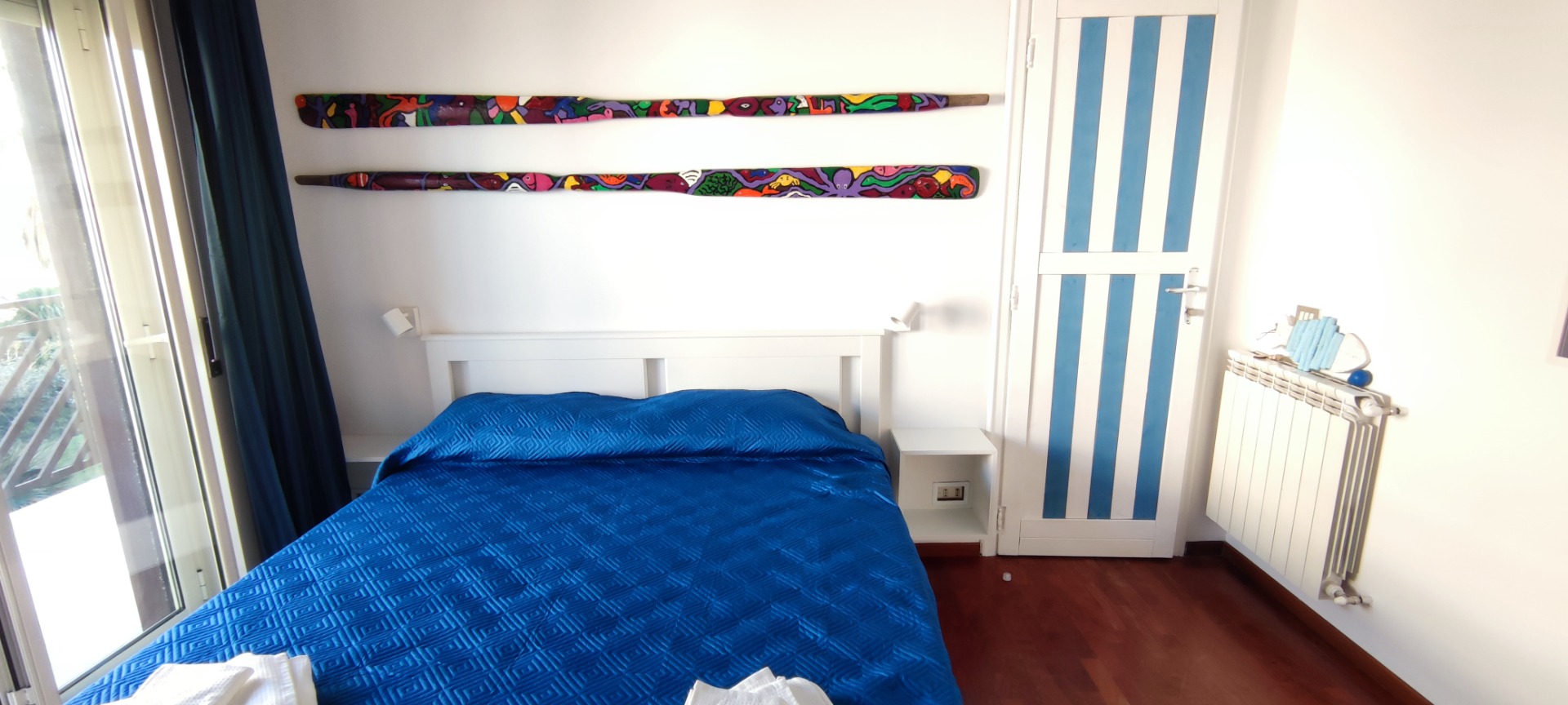 Camera ispirata all'estate, alla voglia di mare e di vacanza. Letto matrimoniale con materasso ortopedico semirigido, per un sonno ristoratore. Quadri e installazioni che riportano ai colori del mare di Sicilia. Blu è il colore dominante. tutto sa di vacanza, anche il balconcino privato con tavolino e sedie, rigorosamente blu, per una colazione romantica. Camera climatizzata, riscaldata, tv Android 45", specchio, luminosissima.